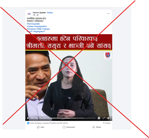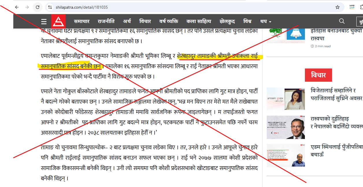 समाचारमा प्रत्यक्षतर्फ उम्मेदवारी दिएर पराजित भएका नेताका श्रीमती समानुपातिकतर्फ सांसद बनेको दावी गरिएको छ।