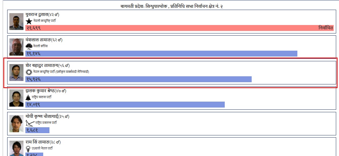 हामीले निर्वाचन आयोगको आधिकारिक वेबसाइटमा जाँच गर्दा शेरबहादुर तामाङले सिन्धुपाल्चोक क्षेत्र नम्बर २ मा प्रत्यक्षतर्फ उम्मेदवारी दिएको र चुनावमा पराजित भएको पुष्टि भयो।