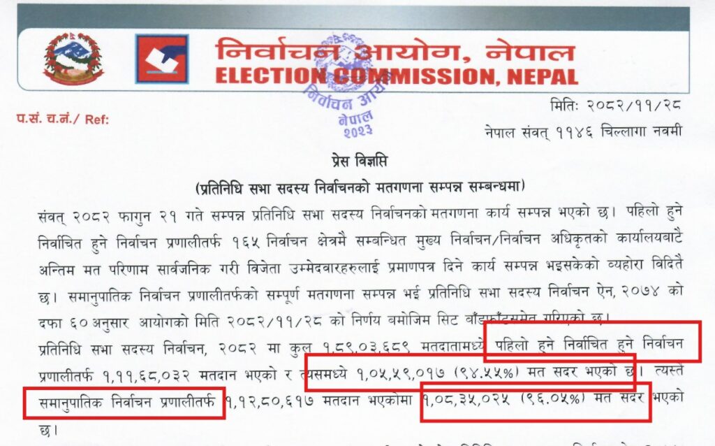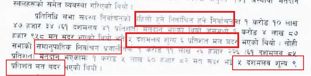 ‘गोरखापत्र’ले प्रत्यक्ष र समानुपातिक दुवै प्रणालीको औसत प्रतिशतलाई आधार मान्यो, त्यसैले बदर मत “घटेको” देखियो।
