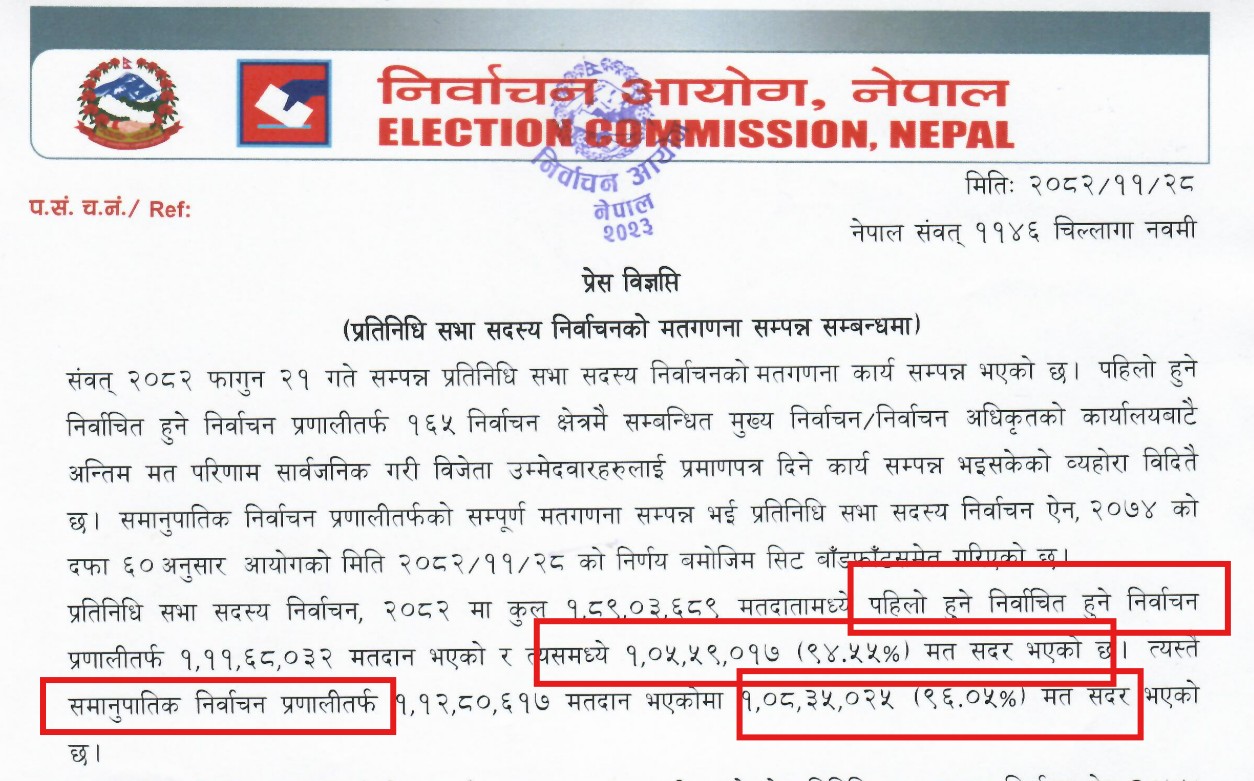 निर्वाचन आयोगले फागुन २८ गते प्रकाशित गरेको प्रेस विज्ञप्ति अनुसार प्रत्यक्षतर्फ ९४.५५ प्रतिशत मत सदर भएको छ। त्यसैगरी समानुपातिकतर्फ ९६.५ प्रतिशत मत सदर भएको छ।