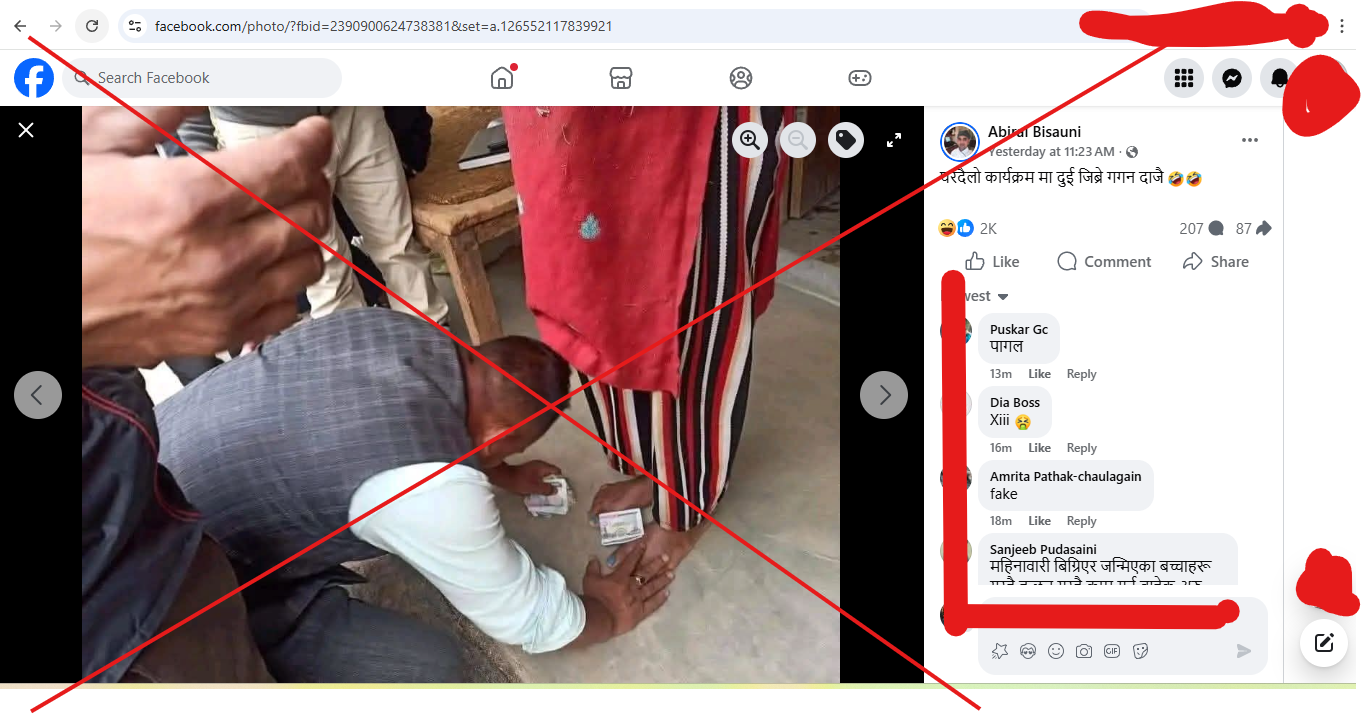 कतार लोकेशनमा रहेको ७३ हजार फलोअर्स भएको ‘Abiral Bisauni’ नामक फेसबुक प्रयोगकर्ताले फागुन १७ (मार्च १, २०२६) मा पोस्ट गरेको फोटोमा एक पुरुषले एक महिलाको खुट्टामा पैसा राखेर ढोगिरहेको देखिन्छ। पुरुष र महिला दुवैको अनुहार फोटोमा देखिन्न। पोस्टमा उक्त व्यक्ति गगन थापा भएको दाबी गरिएको छ।