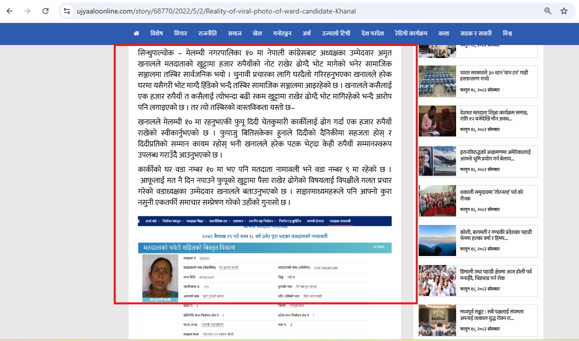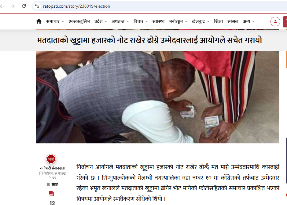 समाचारमा सिन्धुपाल्चोकको मेलम्ची नगरपालिका वडा नम्बर १० मा काँग्रेसको तर्फबाट उम्मेदवार रहेका अमृत खनालले मतदाताको खुट्टामा ढोगेर भोट मागेको फोटोसहितको समाचार प्रकाशित भएपछि निर्वाचन आयोगले स्पष्टीकरण सोधेको विषय उल्लेख गरिएको छ। सोधिएको स्पष्टीकरणमा जवाफ चित्तबुझ्दो नभएको भन्दै आयोगले उनलाई सचेत गराउने निर्णय गरेकोसमेत समाचारमा भनिएको छ ।
