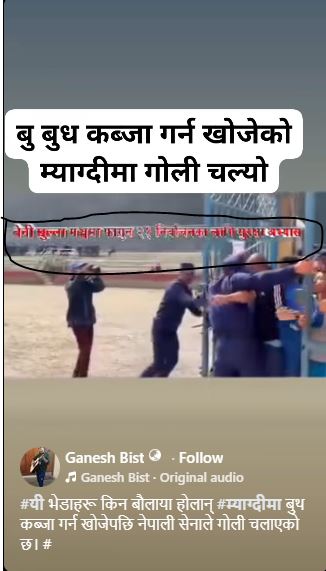 फेसबुकमा ५६ हजार फलोअर्स रहेका गणेश विष्ट नामक प्रयोगकर्ताले “म्याग्दीमा बुथ कब्जा गर्न खोजेपछि नेपाली सेनाले गोली चलाएको छ” क्याप्सन राखेर १५ सेकेन्ड लामो एउटा भिडिओ पोस्ट गरेका छन्।