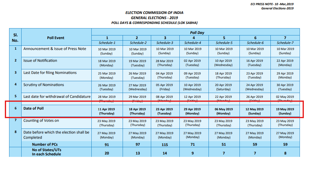 हामीले भारतको लोकसभा चुनाव २०१९ को तालिका पनि खोजी गरेका छौँ । भारतको मुख्य निर्वाचन अधिकारी दिल्लीको वेबसाइट अनुसार सन् २०१९ मा अप्रिल ११ देखि मे १९ सम्म ७ चरणमा चुनाव भएको थियो ।