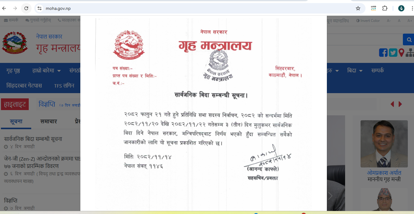 हेर्नुहोसु गृह मन्त्रालयको वेबसाइटमा सार्वजनिक विदासम्बन्धी सूचनाको स्क्रिनसट