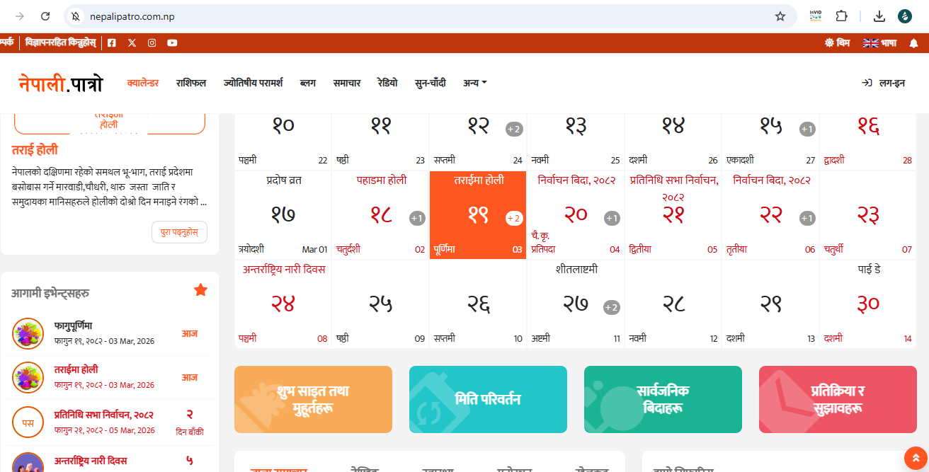 डिजिटल पात्रो नेपाली पात्रोका अनुसार फागुन १८ गते पहाडी जिल्लामा मात्रै होलीको विदा हो भने १९ गते मधेसका जिल्लामा मात्रै। २३ गते शनिबार र २४ गते अन्तर्राष्ट्रिय नारी दिवसको विदा परेको छ। निर्वाचन विदा २०, २१ र २२ गते मात्रै भएको नेपालीपात्रोमा देख्न सकिन्छ ।