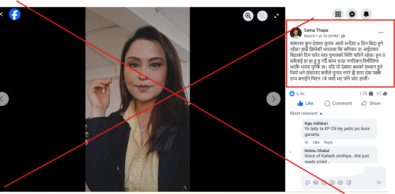 पत्रकार समा थापाले चुनावका लागि ७ दिन बिदा दिएको तथा भारतमा शनिबार वा आइतबार मात्रै चुनाव हुने गरेको दावीसहित फेसबुक पोस्ट गरेकी छिन्।