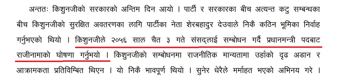 त्यस्तै, भट्टराईका तत्कालीन प्रेस सल्लाहकार किशोर नेपालद्वारा लिखित ‘मेरो समय’ (आत्मकथा) पुस्तकमा पनि भट्टराईले २०५६ चैत ३ गते संसदलाई सम्बोधन गर्दै प्रधानमन्त्री पदबाट राजीनामा दिएको उल्लेख गरिएको छ।