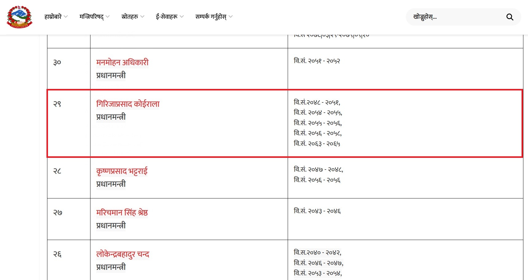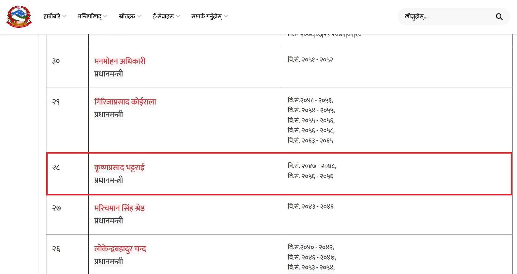 त्यसपछि हामीले प्रधानमन्त्री तथा मन्त्रिपरिषद्को कार्यालयको आधिकारिक वेबसाइट जाँच गर्यौँ। वेबसाइटमा उपलब्ध विवरण अनुसार कृष्णप्रसाद भट्टराईले दोस्रो पटक वि.सं. २०५६ मा प्रधानमन्त्रीको जिम्मेवारी सम्हालेको उल्लेख छ।