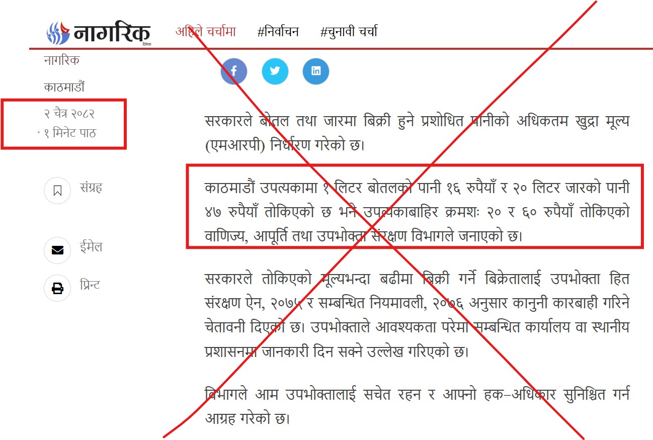 पुरानो सूचनालाई आधार बनाएर पानीको मूल्यबारे भ्रामक समाचार