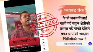 नेपाली कांग्रेसका सभापति गगन थापाले जनजातिलाई गाली गर्दै ब्राह्मण क्षेत्रीको पक्षमा बोलेको दावीसहितको भिडिओ सामाजिक सञ्जालमा भाइरल बनेको छ। तर, हामीले गरेको तथ्य जाँचमा ७...