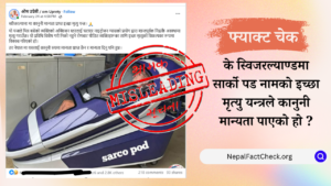 स्विजरल्याण्डमा सार्को पोड नामको इच्छामृत्यु यन्त्रले कानुनी मान्यता प्राप्त गरेको दावीसहितको पोस्ट फेसबुकमा भाइरल भएको छ। तर, हाम्रो तथ्यजाँचमा यो दावी भ्रामक रहेको देखियो। स्विस...