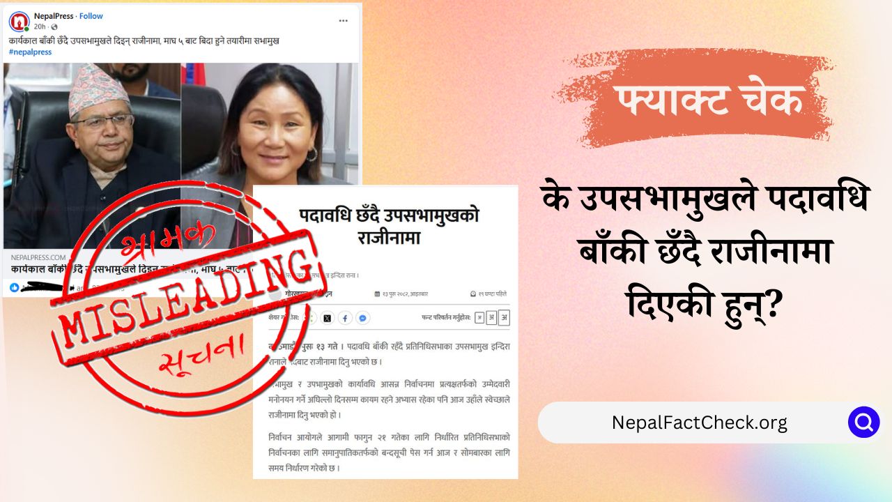 प्रतिनिधिसभाका उपसभामुख इन्दिरा रानाले पदावधि बाँकी छँदै पदबाट राजीनामा दिएको दावी सहितका समाचार प्रकाशित भएका छन्। तर, हाम्रो तथ्यजाँचले उक्त समाचार भ्रामक रहेको देखाएको छ।...