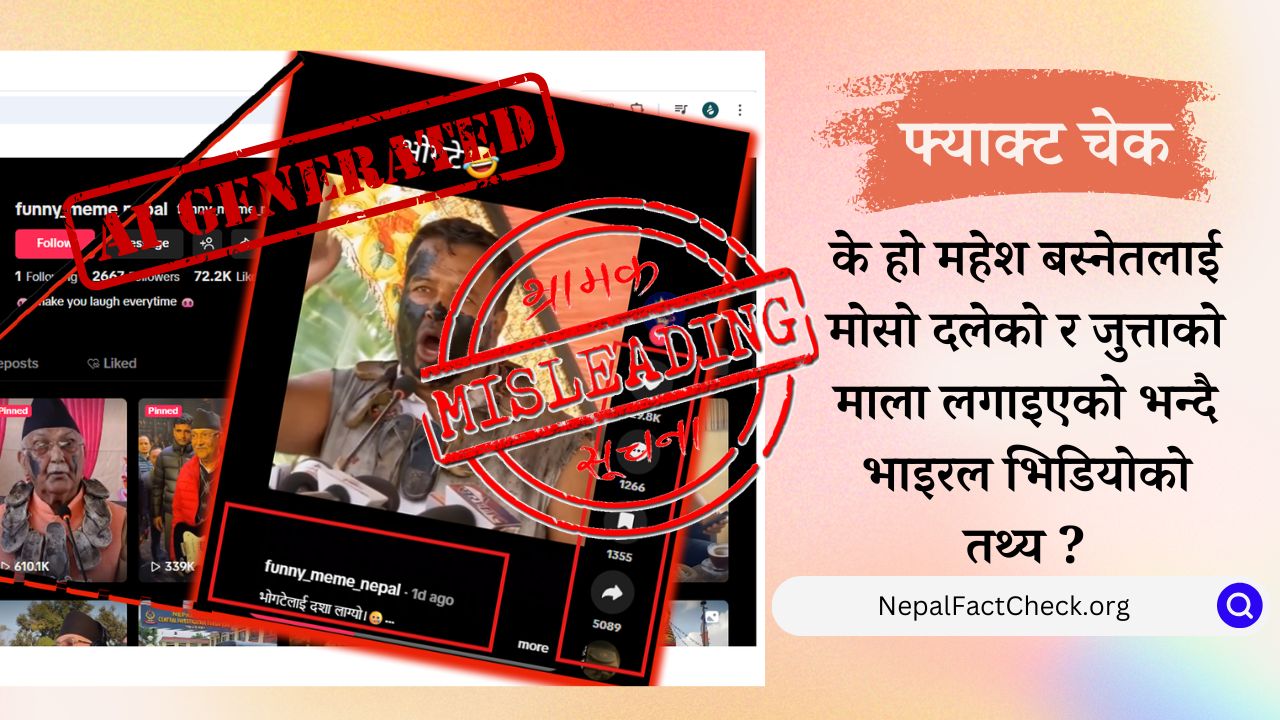नेकपा एमालेका नेता महेश बस्नेतलाई एक कार्यक्रममा मोसो दलेर जुत्ताको मालासहित जनताले लखेटेको दाबीसहितको एउटा भिडियो सामाजिक संजालमा भाइरल छ। तर, हाम्रो तथ्य जाँचले यो...